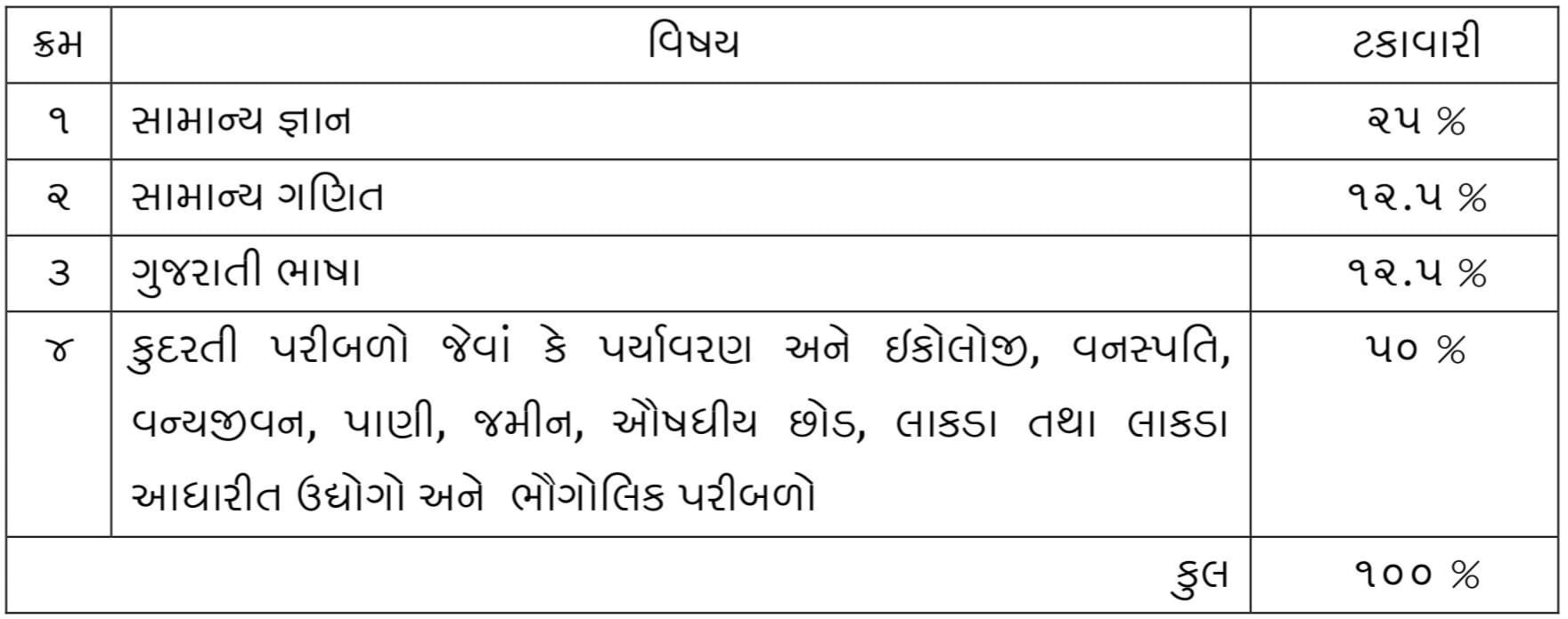 •  લેખિત પરીક્ષામાં ૨ ગુણના 100 પ્રશ્નો લેખે કુલ 200 ગુણની રહેશે અને પરીક્ષાનો સમયગાળો 2 કલાક રહેશે.