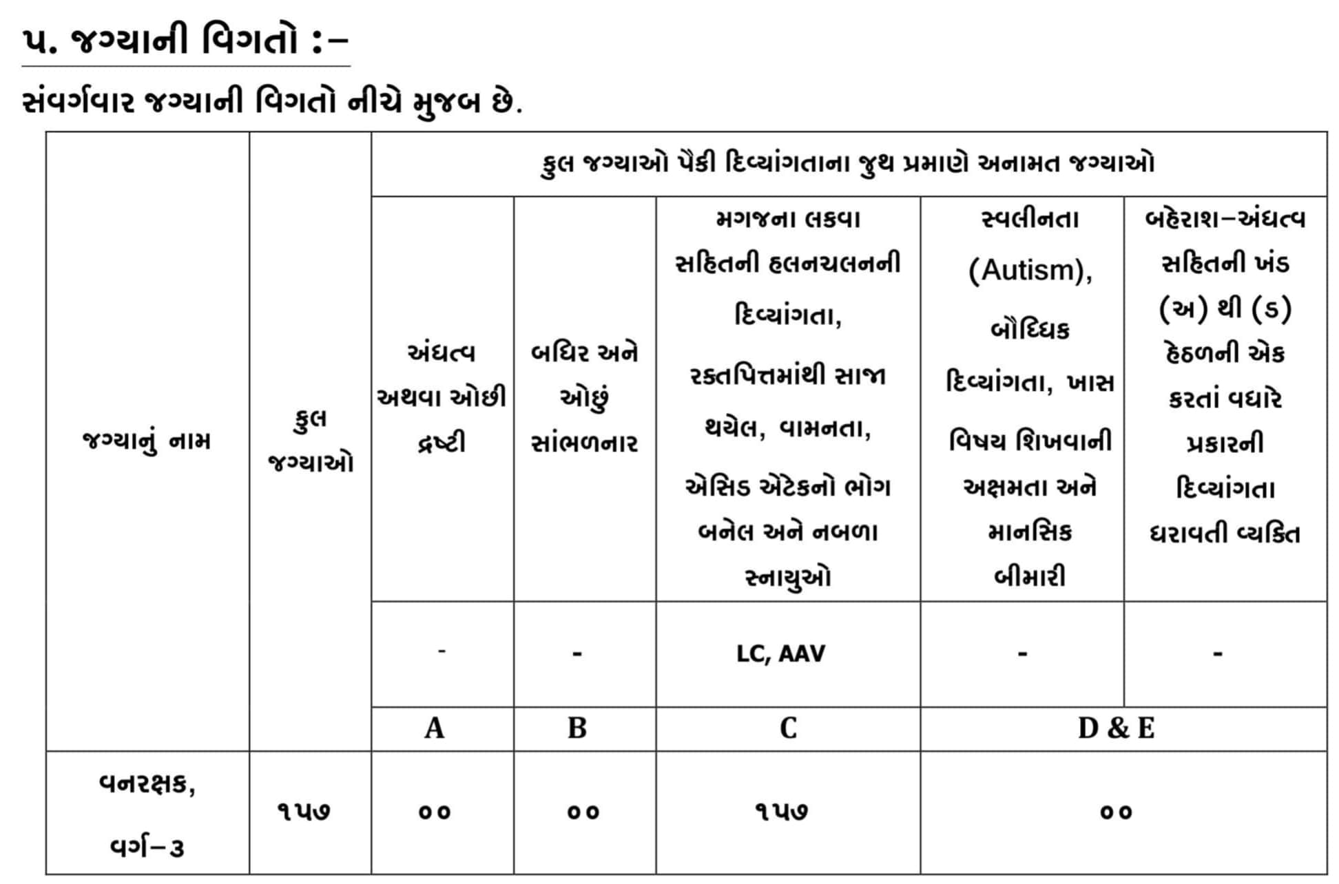 આ ફોરેસ્ટગાર્ડની ભરતી 12 પાસ પર કુલ 157 જગ્યાઓ પર જાહેર કરેલ છે.આ ભરતીની વિગતવાર સંપૂર્ણ માહિતી આજનાં આ લેખમાં જોઈશું જેમ કે પોસ્ટ, શૈક્ષણિક લાયકાત, ઉંમર મર્યાદા, પગાર, પરિક્ષાનો સિલેબસ, ફિઝિકલ ટેસ્ટ, ફોર્મ ભરવાની પ્રક્રિયા જેવી સંપુર્ણ માહિતી તેથી લેખ સંપૂર્ણ કાળજીપૂર્વક વાચી આજ આપેલ યોગ્યતા ધરાવતા હોય અને ફોર્મ ભરવા ઈચ્છતા હોય તો વહેલી તકે ફોર્મ ભરી દેવું.