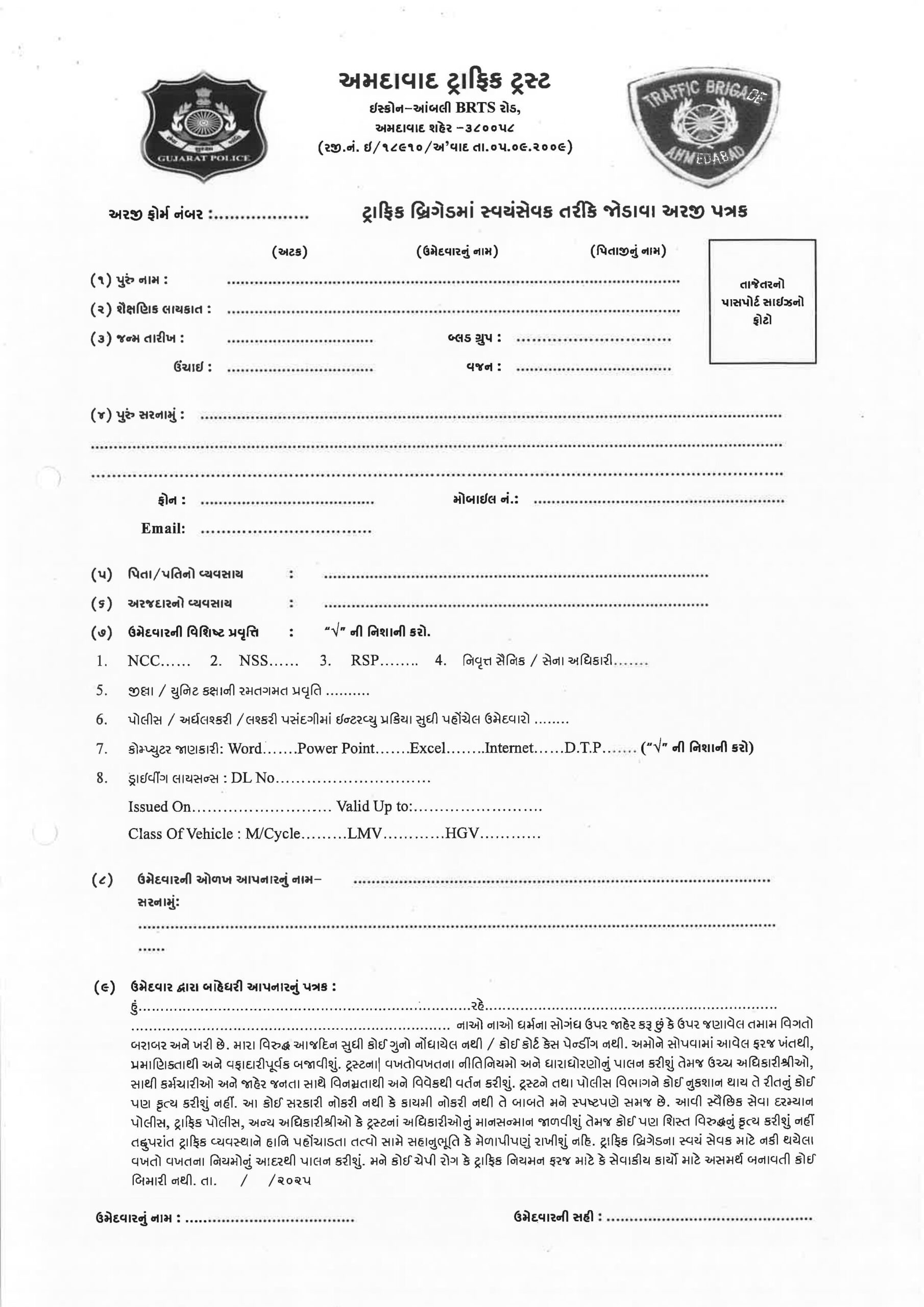 (2) ટ્રાફિકની બ્રિગેડમાં માનદ સેવક/સેવિકા તરીકે જોડાવા માટે નિયત ફોર્મ https://cpahmedabad.gujarat.gov.in/ઉપરથી ડાઉનલોડ કરી શકાશે અથવા નીચેની કચેરીઓથી વિના મૂલ્યે કચેરીના સમય દરમ્યાન મેળવી શકાશે.
